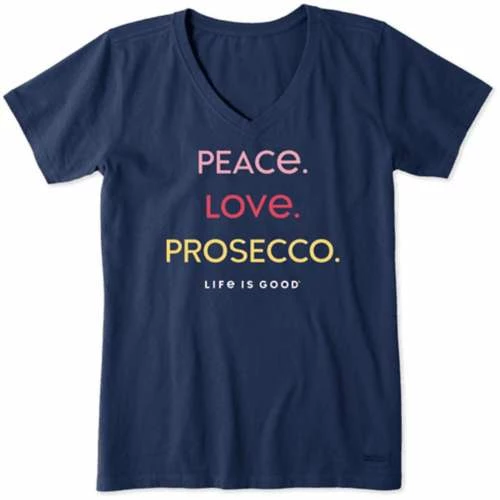 Cheap π Shirts π© Women’s Life Is Good Peace Love Prosecco Crusher Lite V-Neck T-Shirt β€οΈ
